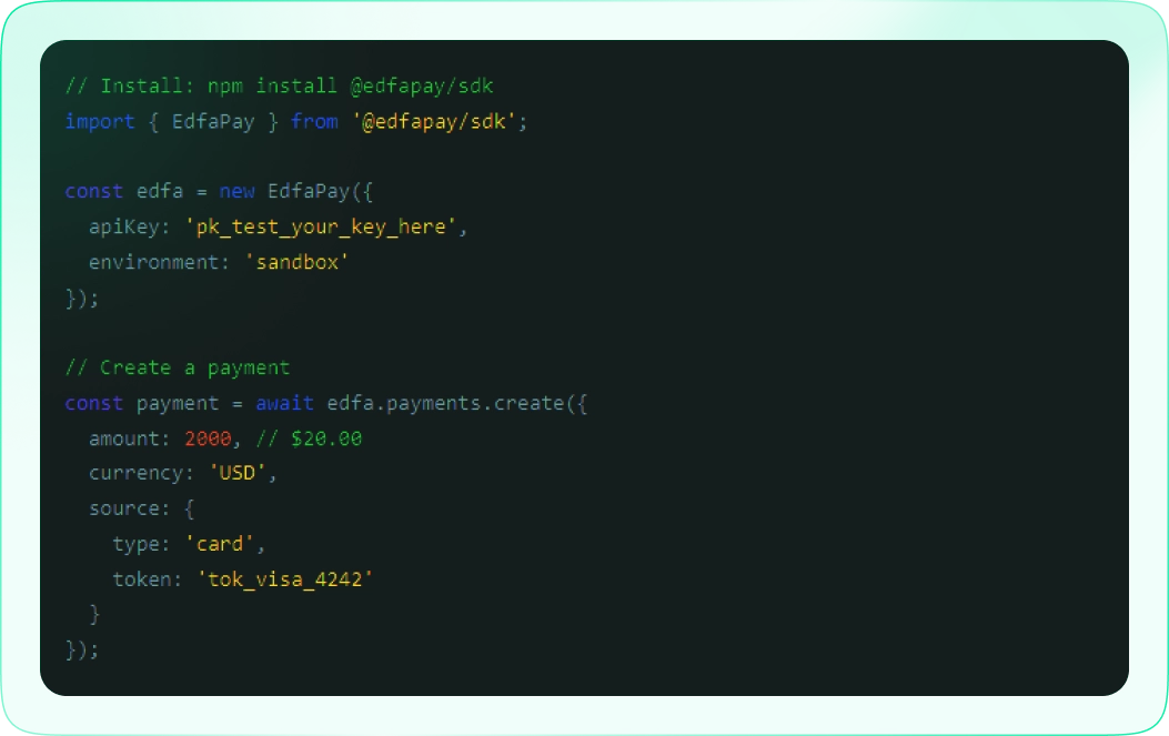 // Install: npm install @edfapay/sdk